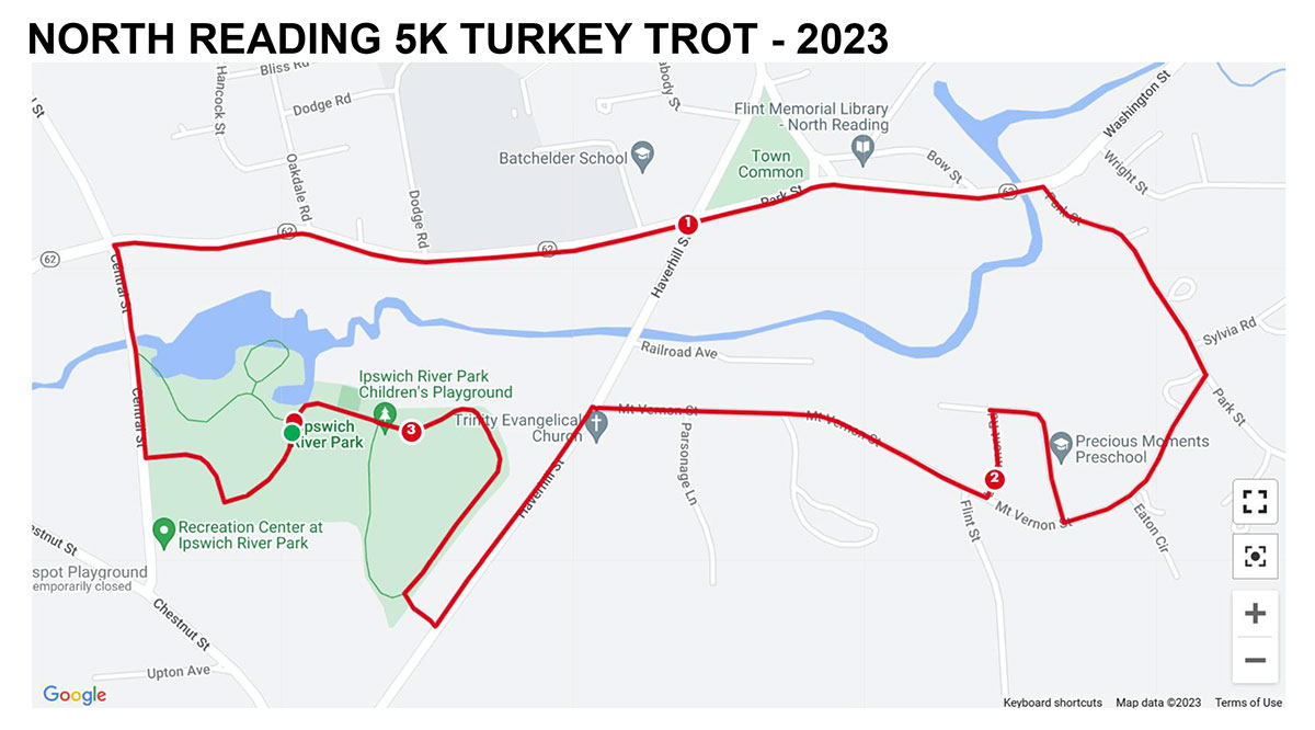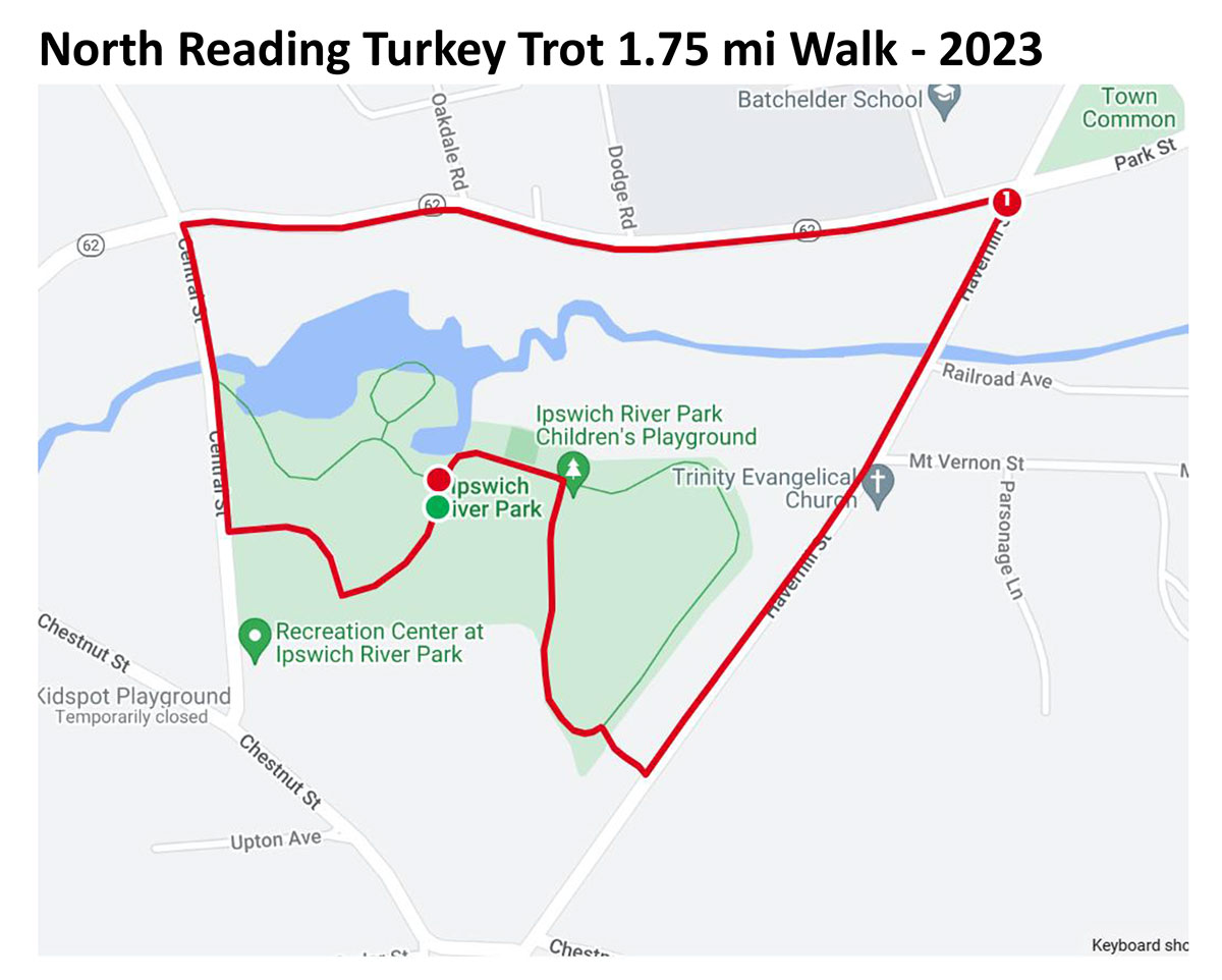 WALKERS participating in the 1.75-mile Turkey Trot will follow a new route this year, due to the closure of Chestnut at Park Street. The walk starts and ends inside Ipswich River Park. Walkers will turn right onto Central St.; right onto Park St.; right onto Haverhill St. (at Ryer’s) and turn right into the back section of IRP via the path on Haverhill St. Walkers will turn left inside the park, passing the tennis courts and head back to the finish line. (Map courtesy of Hornet HOF Committee)