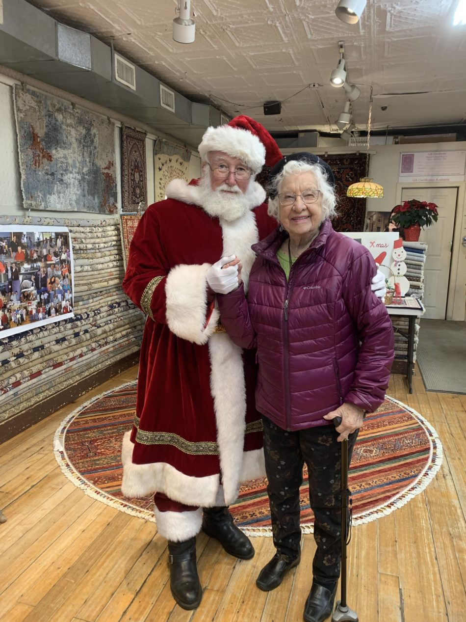 AT 101, FLORENCE LUNDSTROM of Melrose enjoyed meeting Santa at Melrose Oriental Rug store during Home for the Holidays. (Photo courtesy of Janet Lundstrom)