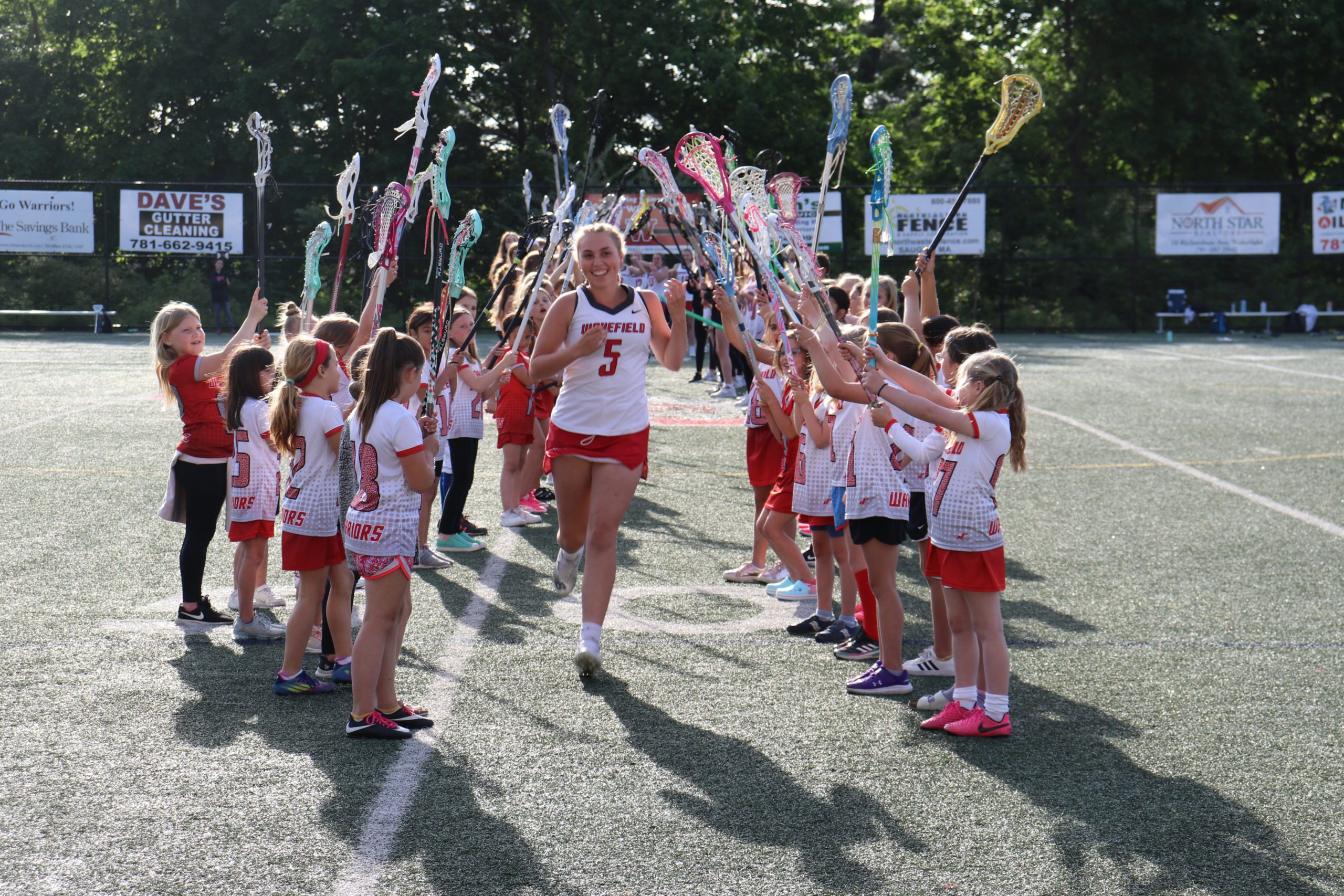 WAKEFIELD YOUTH lacrosse players helped the Warriors celebrate the seniors including Caroline Benedetto who is pictured running through the tunnel. (Dan Pawlowski Photo)