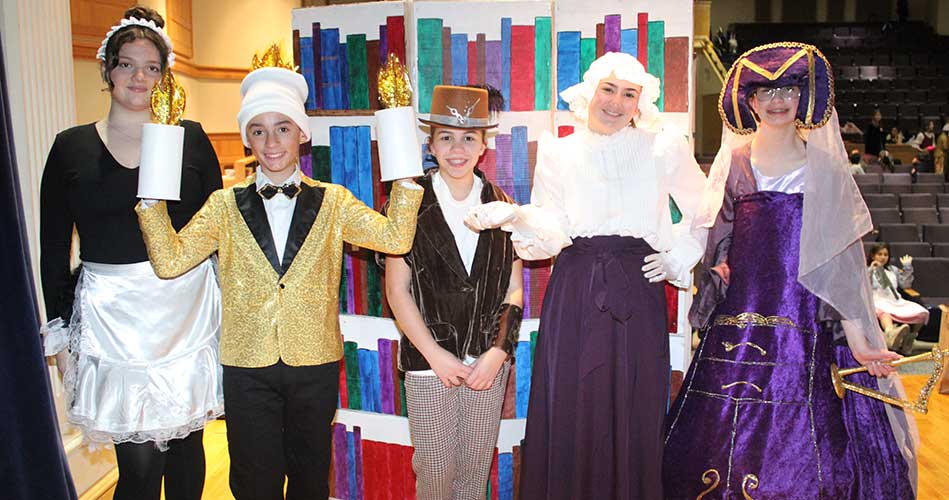 LYNNFIELD MIDDLE SCHOOL’S production of “Beauty and the Beast Jr.” last weekend featured, from left, Mia Martins as Babette, Anthony Paone as Lumiere, Nora Donovan as Cogsworth, Sabrina Hayman as Mrs. Potts and Nora Hutter as Madame de la Grande Bouche. (Dan Tomasello Photo)