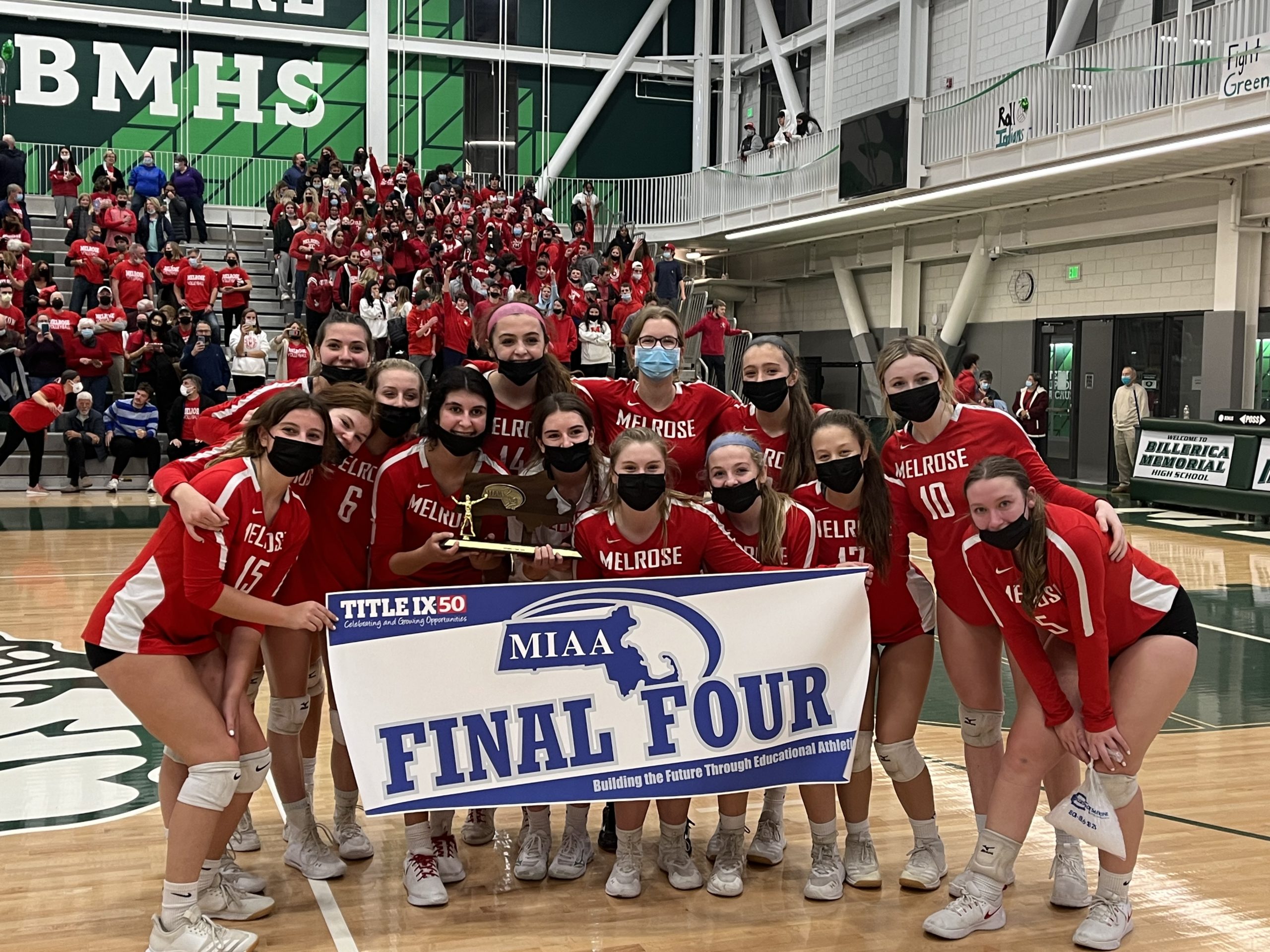 After the winning kill, the MHS student fan section poured on to the court in victory formation. Melrose captains Elena Soukos (22 kills), Chloe Gentile, Autumn Whelan and Abby Hudson (who traded her knee for a trophy) were presented the Final Four trophy along with coaches Scott Celli, Ryan Schmitt and Lydia Mays. “It was the greatest comeback in Melrose volleyball history,” said coach Celli after the game. Fans agreed, and were heard saying “Best game I’ve ever been to in my life” in the days to come. If anyone wonders why Melrose is “Volleyball USA” it’s because of games like this.