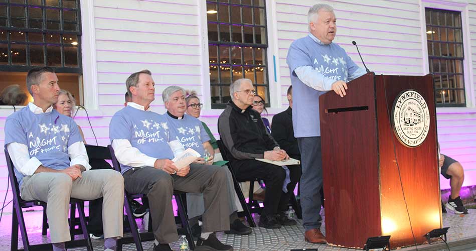 TOWN ADMINISTRATOR Rob Dolan (standing at podium) addresses the 200 attendees at A Night of Hope on Sept. 28. The Think of Michael Foundation and A Healthy Lynnfield hosted the seventh annual ceremony once again. (Dan Tomasello Photo)