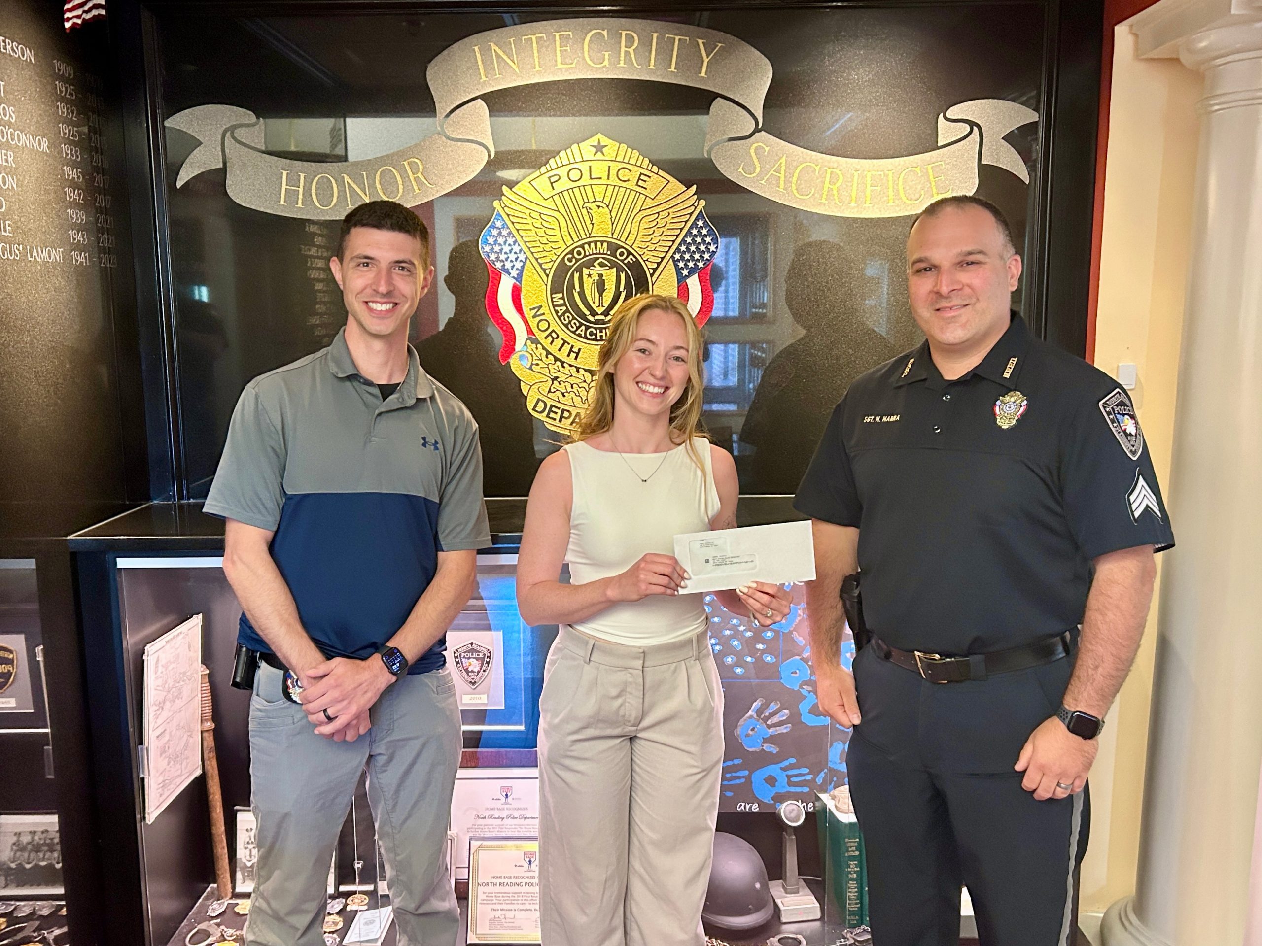 AMAZON ROBOTICS Facilities Manager Rachel Bousquet (center), presented a $15,000 donation to support the Drone Program of the North Reading Police Department. Accepting the donation on behalf of the department were Det. Paul Lucci (at left) and Sgt. Michael Marra. (Photo Courtesy of NRPD)