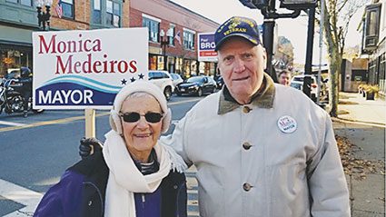 FIRST TIME VOLUNTEERS Marie Retalic and her husband Donald Retalic stand out for Monica Medeiros. The Retalic’s met Monica when she knocked on their door and were so impressed they volunteered on their first political campaign.(Jim Shaer Photo)