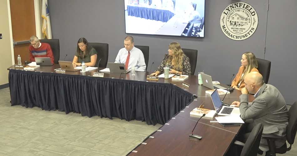 SCHOOL COMMITTEE CHAIR Kristen Grieco Elworthy (second from left) said on Sept. 24 that the school board’s attorney ‘did not recommend or require” School Committee member Kate DePrizio (fourth from left) to read a letter that made a series of allegations against School Committee member Jamie Hayman (at far right) during a previous meeting on Sept. 11.