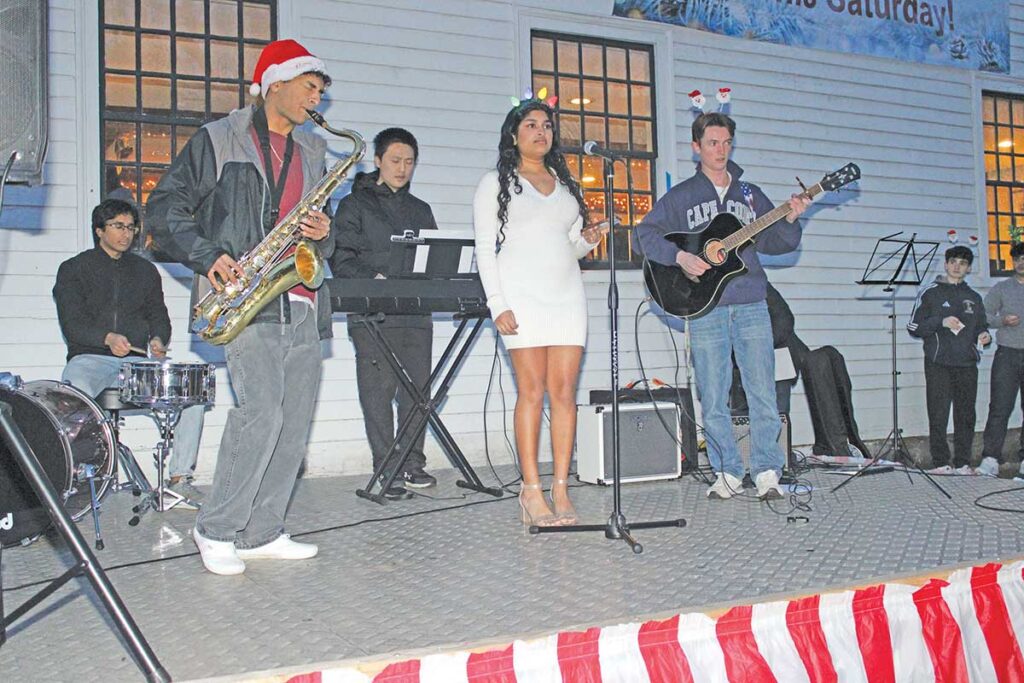 LYNNFIELD HIGH SCHOOL band students, from left, drummer Shlok Kudrimoti, saxophonist Josh Robins, keyboardist Josh Robins, vocalist Jerusha Robins and guitarist Charlie Morgan performed a cover of Wham’s “Last Christmas” during Lynnfield Recreation’s “Tree Lighting: A Whobilation Celebration.” (Dan Tomasello Photo)