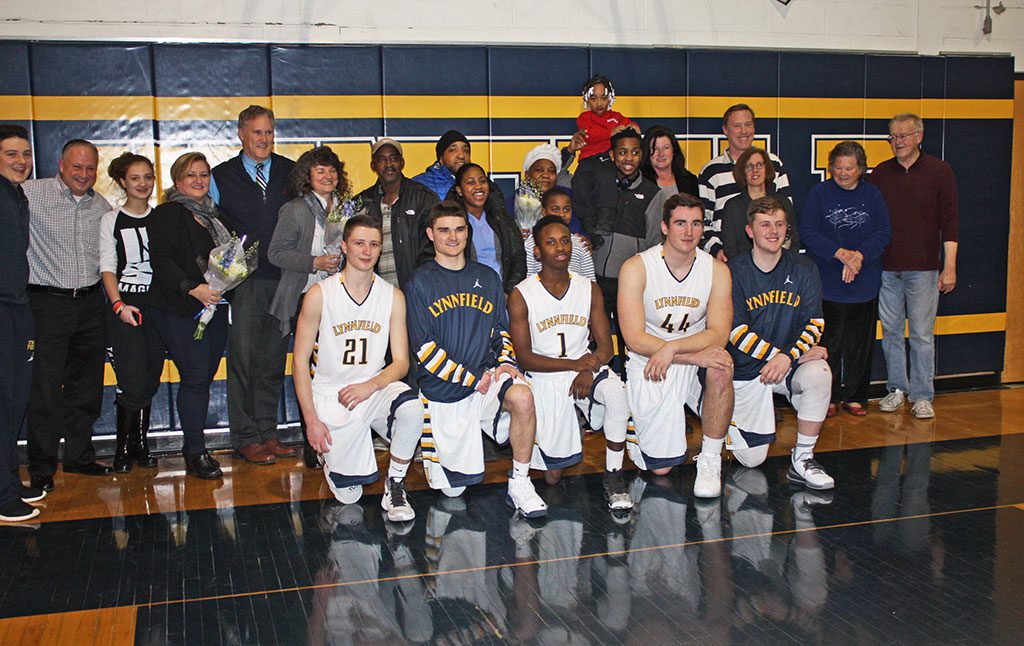BOYS’ BASKETBALL seniors, from left, Tucker Torosian, captain Brendan Sullivan, Esaie Philantrope, Cameron DeGeorge and captain Jake McHugh celebrated their senior year with their respective families before the Pioneers defeated Newburyport 61-43 Feb. 9. (Dan Tomasello Photo)
