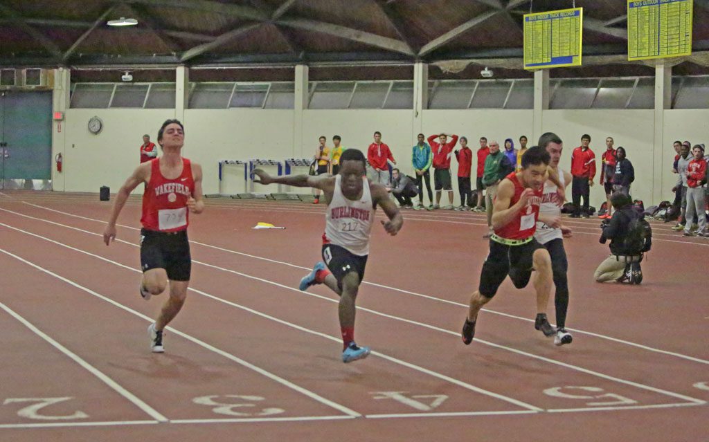 The event in the 45 yard dash as junior Eric Chi and Burlington’s Chenet Guerrier were involved in an extremely close race. When the teams left Lexington last night it was believed that Chi had won the event by two hundredths of a second, 5.425-5.427, which was thought by Wakefield to have ultimately decided the meet in its favor as it edged Burlington, 44-42.