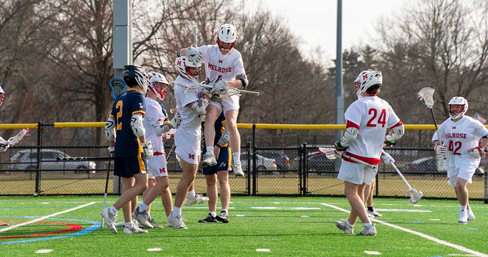 Melrose kicked off their winning ways on March 28 against a competitive Lynnfield team, who beat Melrose in 2024. This time Melrose was in control and was led in scoring by senior captain Nick Hitchman, who had 5 of the team’s goals while teammate Finn Alpers clocked in with three.