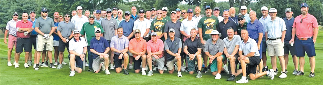 OVER 150 golfers and supporters of the North Reading Diamond Club, including this large contingent of baseball alumni, participated in the club’s 10th annual golf tournament at the Hillview to support North Reading baseball programs. Joining them was retired Coach Frank Carey (2nd row, third from left). (Courtesy Photo)