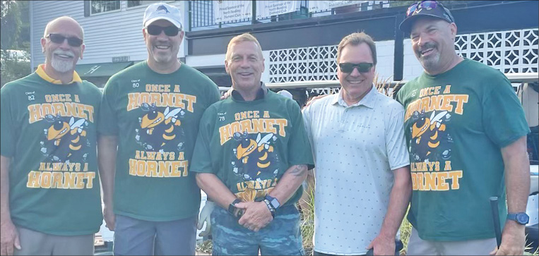 JUST LIKE OLD TIMES! Baseball alumni, from left, Paul Wilkes, Paul Texiera, Russ Ward, Kevin Freeman and Marc Texiera, personify the motto “Once a Hornet Always a Hornet” at the NRDC tournament. (Courtesy Photo)