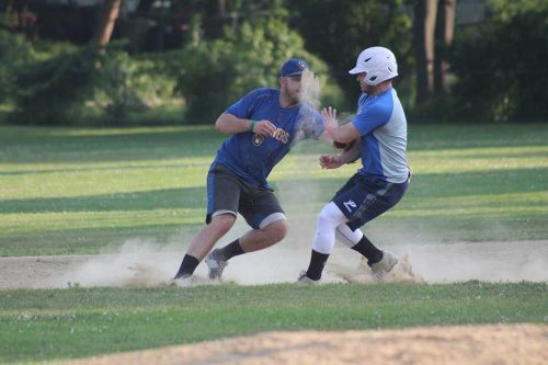 After giving up singles to Mike Canatta and Kyle Grossi in the fourth, Leahy got the final out on a ground ball to Matt Fiore who had great day at short, including a busy top of the fifth. With John Grossi at first, Fiore made a sweet play off the bat of a Chris McNall laser as he ranged to his right, and made a leaping, fading throw to get the force at second for the second out. A much easier 6-4 fielders’ choice from Fiore to Fiore ended the frame.