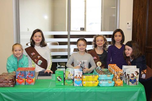 BROWNIES IN the Walton School’s Troop 69011 continue to excel at cookie selling. On Saturday, they were inside The Savings Bank’s headquarters in the Square. Pictured from left to right are Olivia Manzi, Maura Riley, Brooke Macaluso, Lisa Letchford, Madeline Wedemeier and Maeve O’Brien. (Colleen Riley Photo)