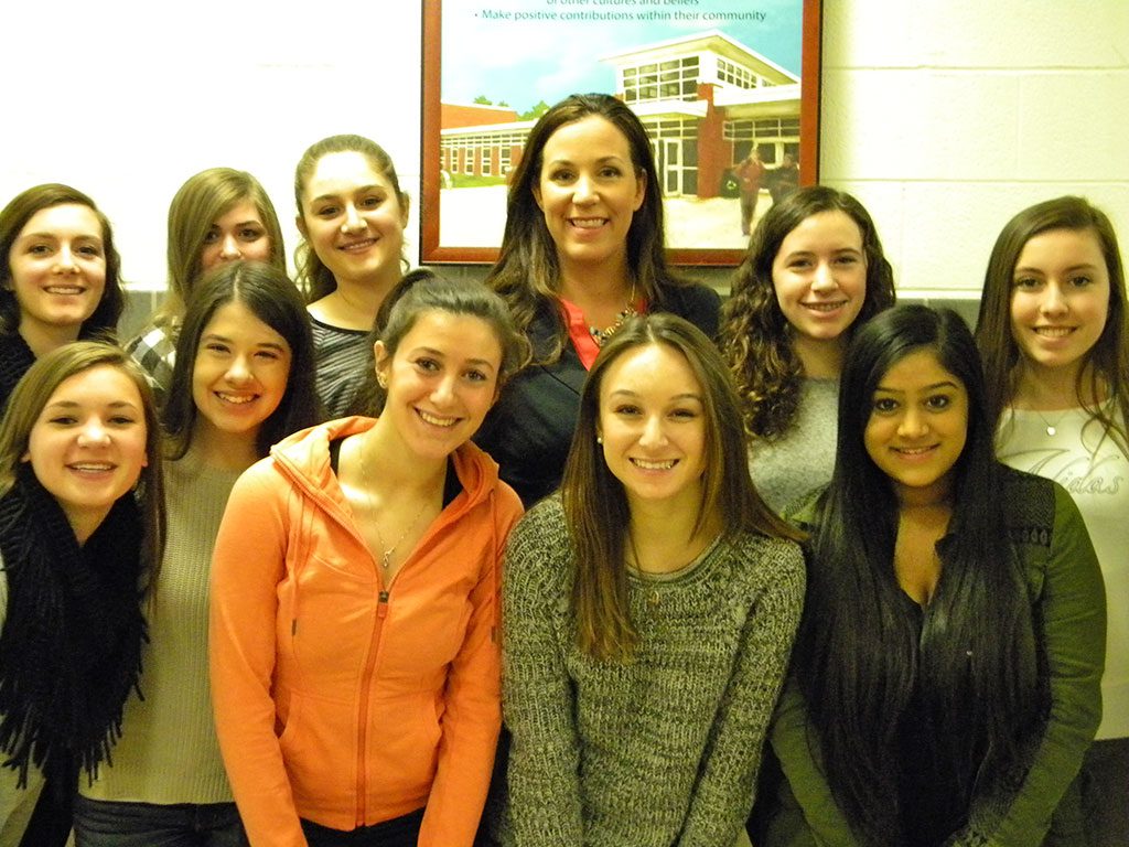 MOTIVATIONAL SPEAKER Cara Filler (center) returned to Lynnfield High School on March 19, where she discussed the dangers of reckless driving and outlined ways to prevent it with LHS sophomores and juniors. Front row, from left, Hannah Scollard, Danielle Douglas, Amanda Sieger, Renee DelNegro and Karan Singh. Back row, from left, Lexi Yannone, Rebecca Simonetti, Rachel DiTullio, Filler, Brianna Weir and Sarah Mezini.  (Dan Tomasello Photo)