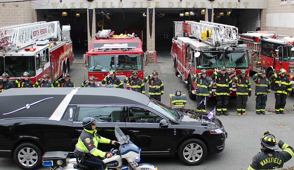 FIREFIGHTERS SALUTE salute Lt. Robert Ford as his funeral procession passes the Wakefield Fire Station. (Mark Sardella Photo) A