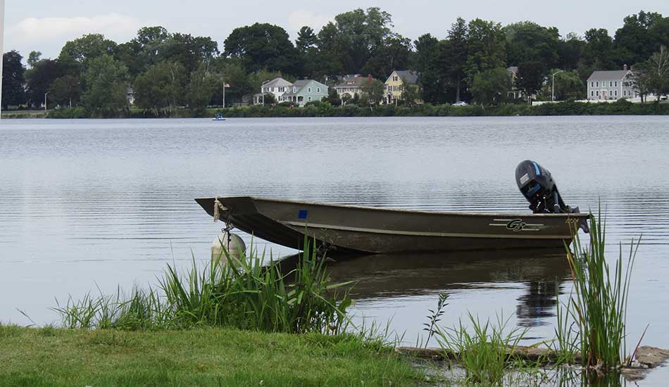 THE TOWN’S emergency boat floats near the boat ramp at Veterans Field, ready for action when needed. (Mark Sardella Photo)