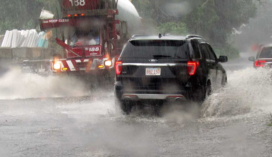 NEW SALEM STREET flooded quickly yesterday afternoon’s storm as drivers found out. (Mark Sardella Photo)
