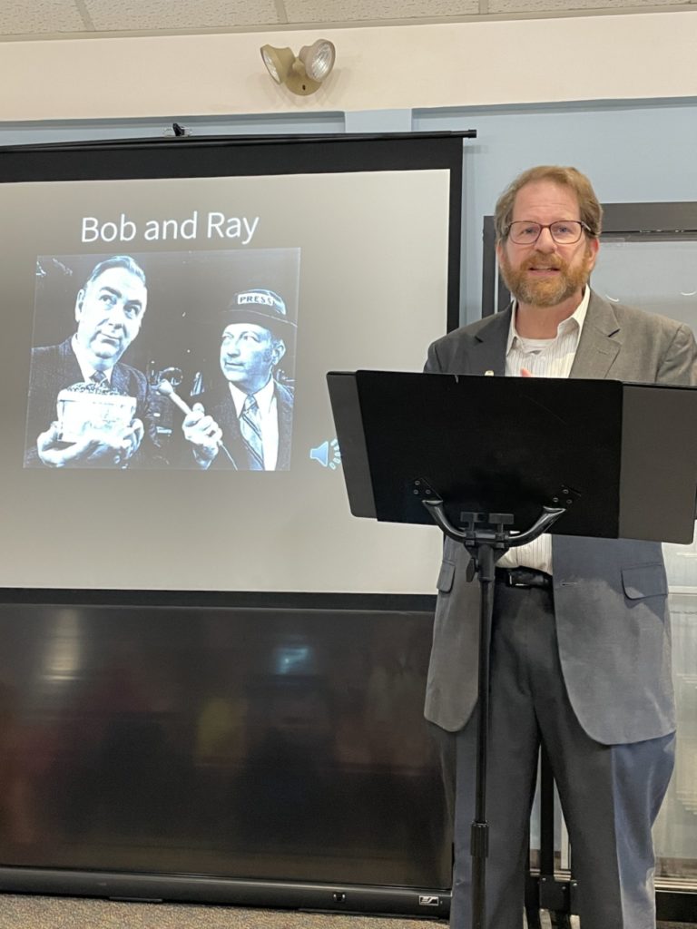 ARTS JOURNALIST NICK ZAINO discusses comedy duo Bob and Ray during a July 19 presentation at the Lynnfield Library. (Dan