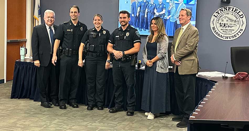 TWO NEW LYNNFIELD POLICE OFFICERS were introduced to the community during the Select Board’s Sept. 29 meeting. From left, Town