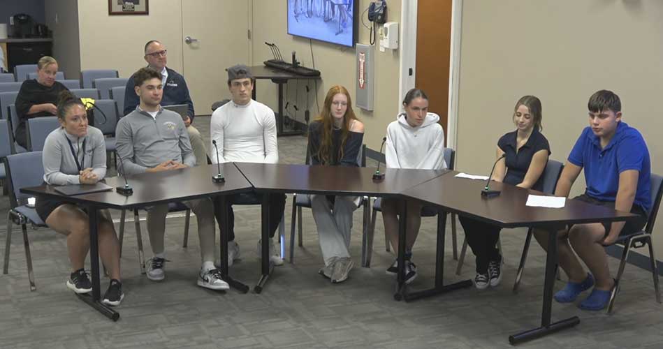 LHS ATHLETIC DIRECTOR Mia Muzio (at far left) and student-athletes, second from left, senior Matthew Tracy, senior Dan Lemieux, junior