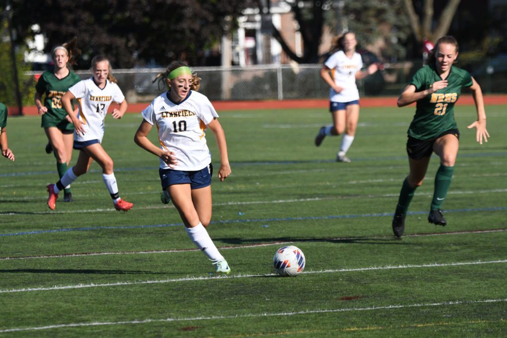 SOPHOMORE MIDFIELDER Emma Rose (10) scored a goal during the girls’ soccer team’s 1-1 tie against North Reading on Sept.