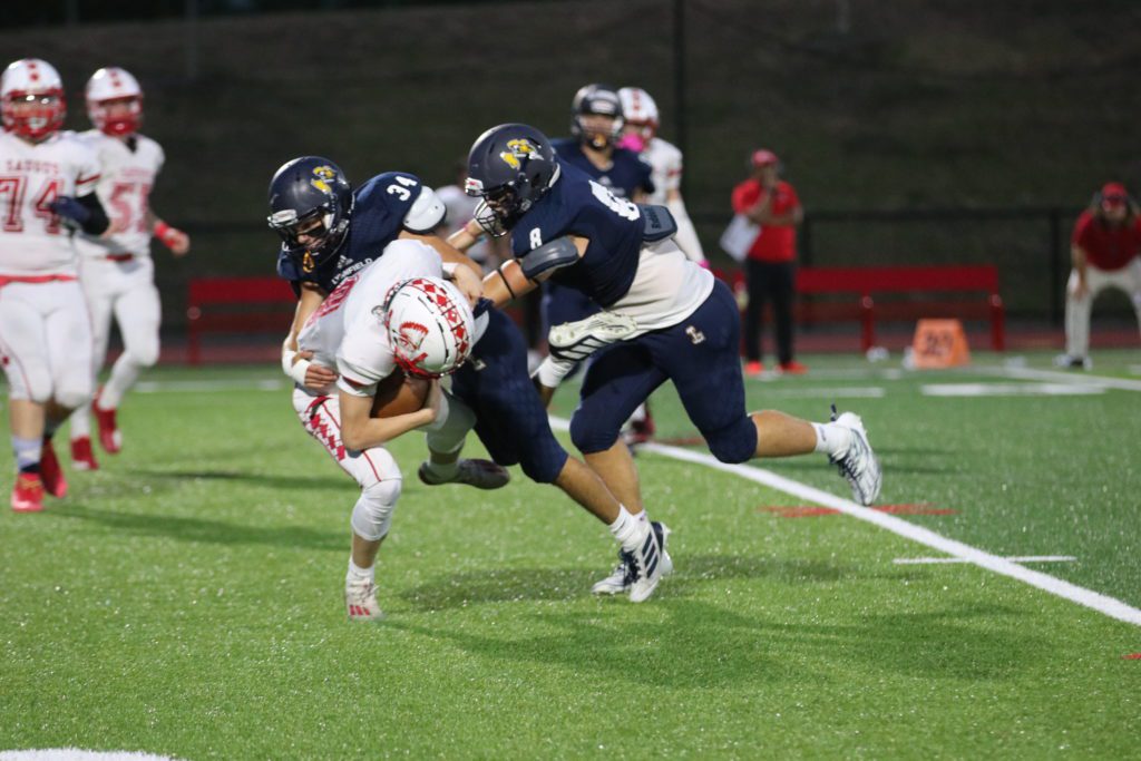 LYNNFIELD’s DEFENSE, including the pictured Devin DeLuties (34) and Sam Gazit (8) were swarming all night in a 37-0 season-opening