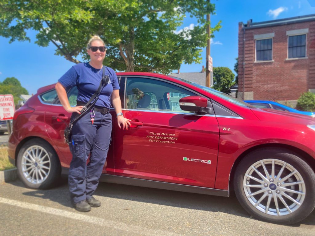 FIRST-YEAR FIREFIGHTER/EMT Christina Harris proudly displays a new electric vehicle that is part of the Fire Department’s fleet. (Courtesy Photo)…