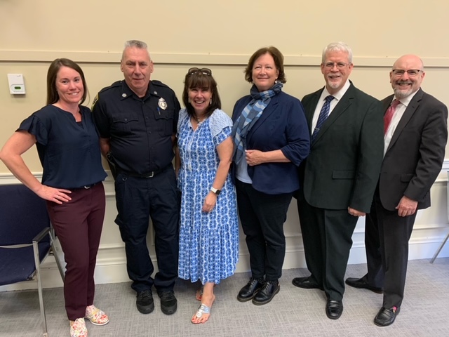 PICTURED HERE IS the Superintendent, SRO Applegate, Kathy Tarpey, Nancy Naslas, Michael McLaughlin and Mayor Paul Brodeur. MELROSE