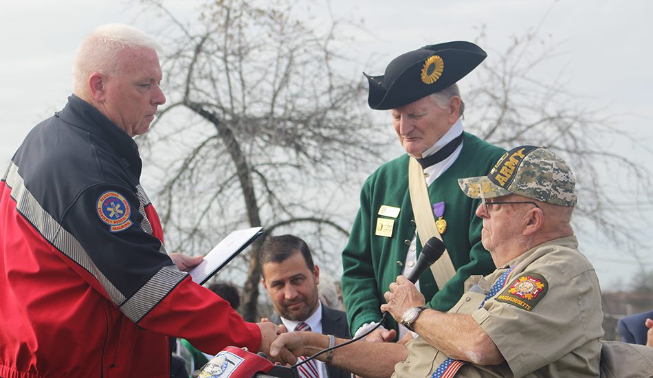 FIREFIGHTER JON BURT, a Marine Corps veteran of Operation Desert Storm, accepts a citation from Arthur Cole, Commander of VFW