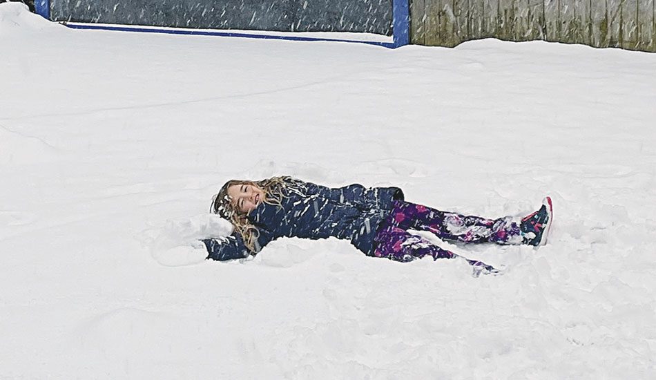 SEVEN-YEAR-OLD Brynn Coyle makes a snow angel while snowflakes swirl in the air all around her. (Maegan Coyle Photo)