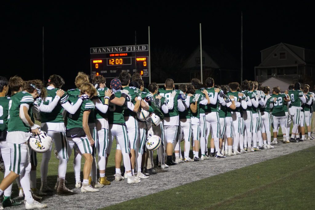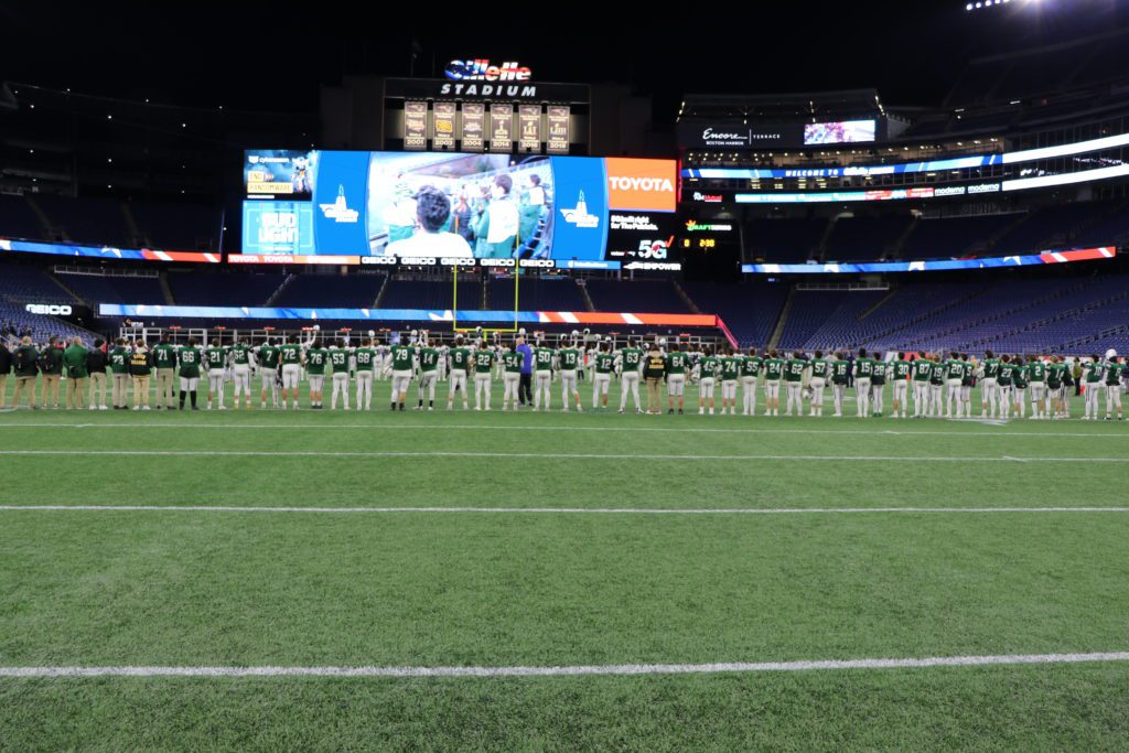 THE NRHS football team lines up for the Div. 5 Super Bowl at Gillette Stadium while the Hornet Marching Band