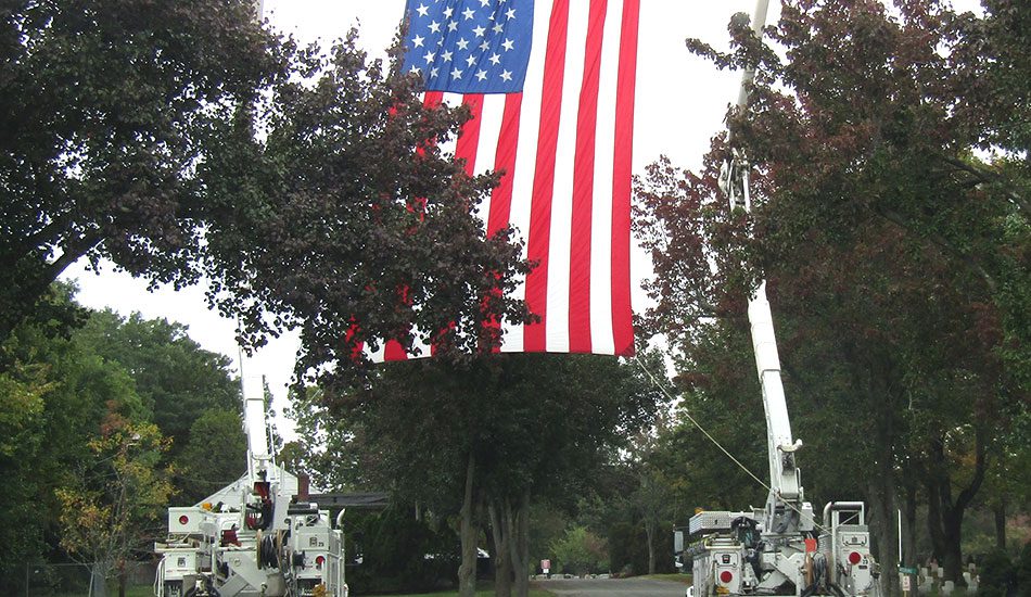 A LARGE AMERICAN FLAG hung over the entrance of Forest Glade Cemetery as Town Councilor Peter May was brought to