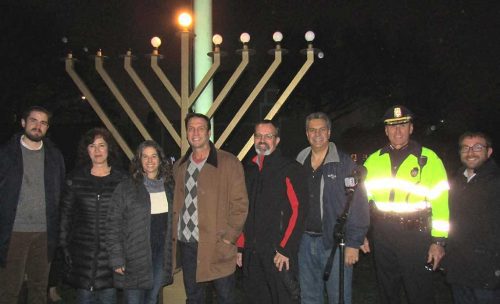 THE FIRST NIGHT of Chanukah was celebrated Sunday night with the lighting of the Menorah on the Common. The celebration was sponsored by Temple Emmanuel of Wakefield and the Chabad of the North Shore. The event drew a large crowd and featured music, hot Latkes, delicious jelly donuts and lots of Chanukah Cheer. Among the participants were (from left) Rabbi Sruli Baron of Congregation Tifereth Israel in Everett, Town Councilor Ann Santos, Marianne Seidman Cohen, Town Councilor Tony Longo, Town Council Chairman Peter May, Town Administrator Stephen P. Maio, Police Chief Rick Smith and Rabbi Gregory Hersh of Temple Emmanuel. (Mark Sardella Photo)