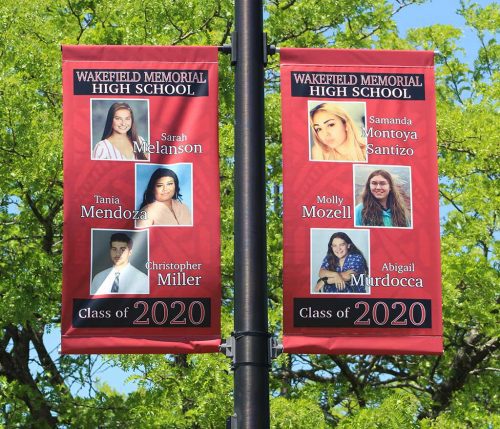 BANNERS RECOGNIZING the members of the Wakefield Memorial High School Class of 2020 were hung on poles along Main Street in the Square over the weekend. The effort was initiated by the high school administration as a visual way to celebrate the Class of 2020. The banners were paid for by the Senior Night Committee and the Rotary Club. WMHS Assistant Principal Gerrilyn Trafficante worked with O’Connor Studios (photographers) to design the banners. The town and the Light Department were instrumental in getting the banners hung up this weekend. (Mark Sardella Photos)