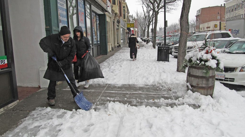 A STORM that swept through the region on Saturday left about four inches of snow. Ralph Caira, owner of The Italian Kitchen of Wakefield on Main Street, was spotted shoveling the sidewalk in front of his store. Forecasters are saying the region will get up to 24 more inches from a nor’easter expected to blast through the area later today and tomorrow. (Gail Lowe Photo)
