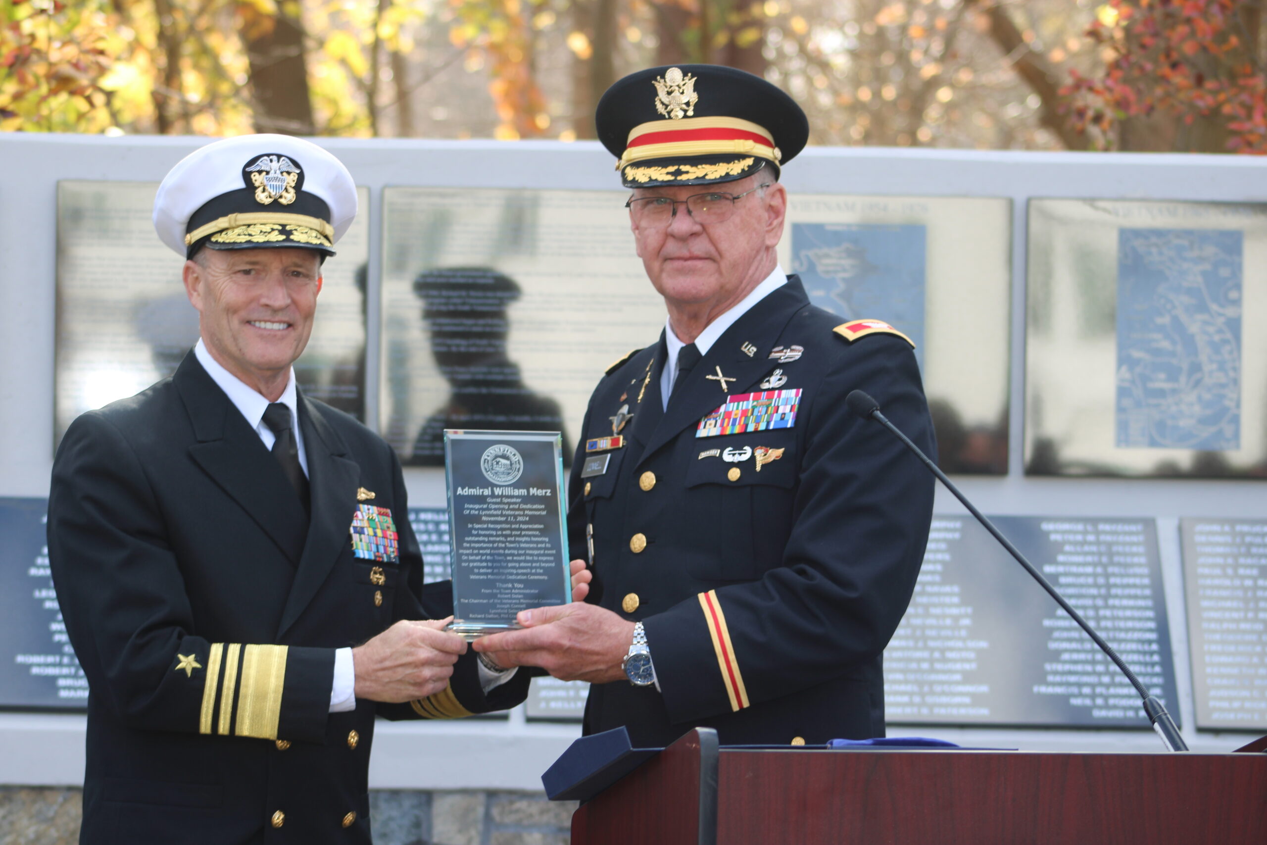 Retired U.S. Navy Vice Admiral William Merz served as the special guest speaker during the Veterans Day ceremony. He thanked Connell for his service to the U.S. and the Lynnfield community.