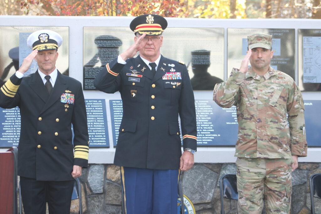 AMERICAN HEROES, from left, retired U.S. Navy Vice Admiral William Merz, Veterans Memorial Committee Chair/retired U.S. Army Col. Joe Connell and Massachusetts Air Force National Col. Chad Forrest salute the American flag while “Taps” was played during the Veterans Day ceremony on Monday. (Dan Tomasello Photo)