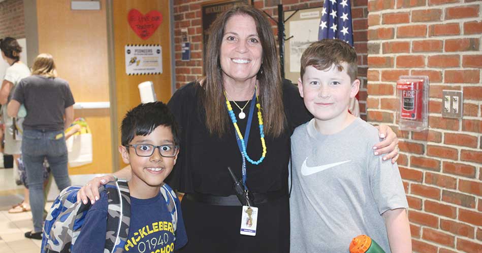 HUCKLEBERRY HILL SCHOOL Principal Melissa Wyland says goodbye to third grader Vihaan Parek and fourth grader Owen Noumi on the last day of school recently. Wyland retired last month after working at Huckleberry Hill for the past 22 years. (Dan Tomasello Photo)