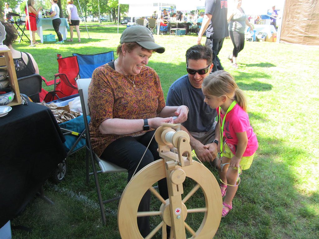 LITTLE ELLA KENT was in awe of Donna Carlstrom of Lynnfield as she spun sheep’s wool at Festival by the Lake on Saturday. Ella was accompanied by her father Jeff Kent of Wakefield.(Gail Lowe Photo)