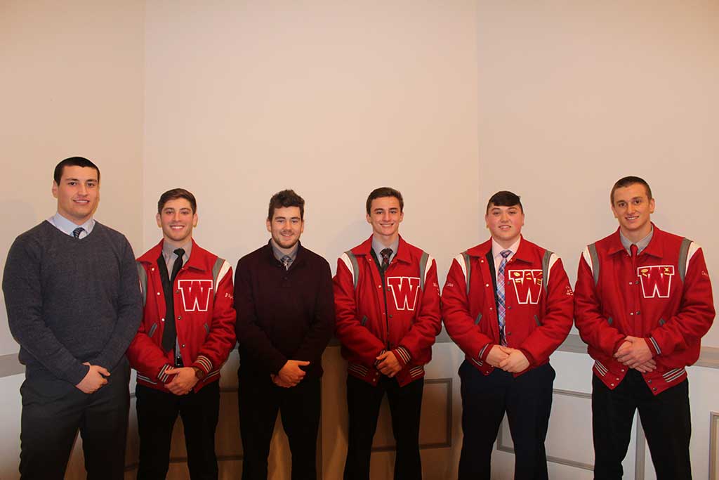 THE WAKEFIELD WARRIOR football team named the new captains for the 2018 season at the postseason banquet. The 2017 captains, Brendan Coughlin, Ryan Fitzpatrick, Alex Joly and Devin O’Brien, handed off leadership duties to the new captains for 2018: Mike Lucey and Danny Marinaccio. Pictured from left to right is O’Brien, Fitzpatrick, Lucey, Marinaccio, Joly and Coughlin. (Dan Pawlowski Photo)