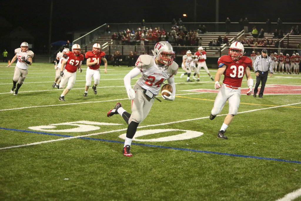 On the very next play from scrimmage, Martin got his first touch of the game and it wasn’t a good one for the senior standout. The ball was fumbled and Hickey picked up the loose ball at the Wakefield 43 and returned it for a touchdown as the Red Raiders scored twice in the matter of 23 seconds.