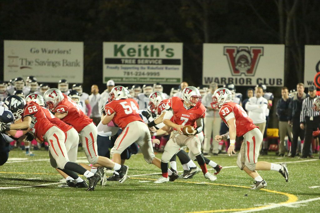 Penney (54 yard on eight carries) then ripped off a 21 yard run to bring the ball into Warrior territory with a first down at the Wakefield 34. Beray gained five yards, Penney gained three yards, and junior RB Matt Woods gained two yards for a first down. Senior QB Ryan Carracinno gained four yards on a keeper, Woods was stopped for no gain and Carracinno ran for five yards setting up a fourth down and one play from the Wakefield 15. Penney got two yards to move the chains.