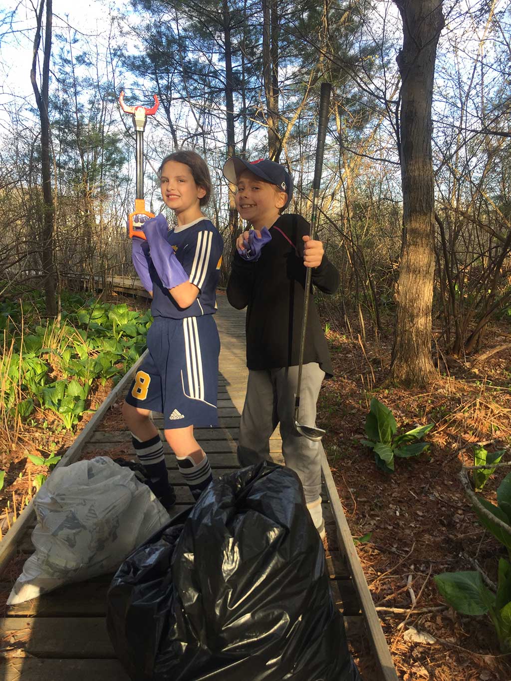 “We had to lean in toward the water to fish litter out,” Olivia added. “We got gloves, bags, made a giant stick and used a golf club and a toy grabber.”
