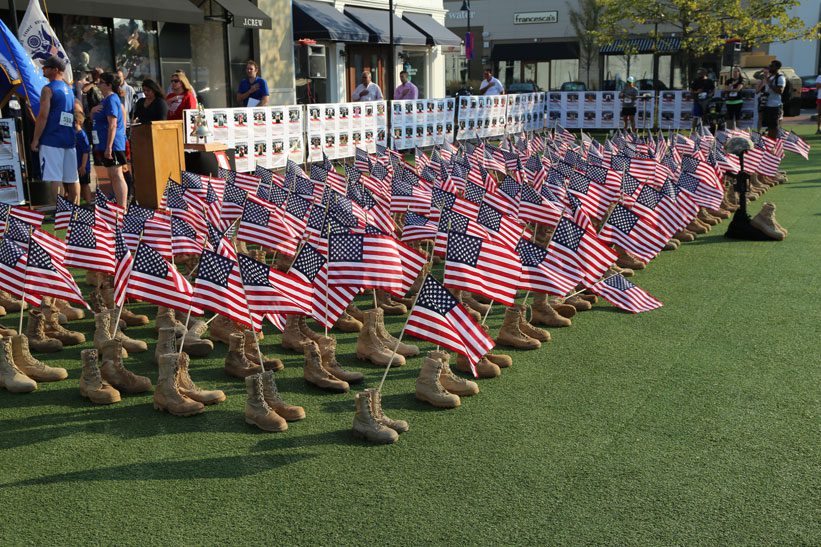 PAIRS OF BOATS, each adorned with an American flag, represent the nearly 240 U.S. servicemen and servicewomen from Massachusetts who have given their lives serving their country since Sept. 11, 2001. Each name was read aloud at the Run for the Fallen ceremony at MarketStreet Saturday organized in their memory by the Military Friends Foundation. (Courtesy Photo)