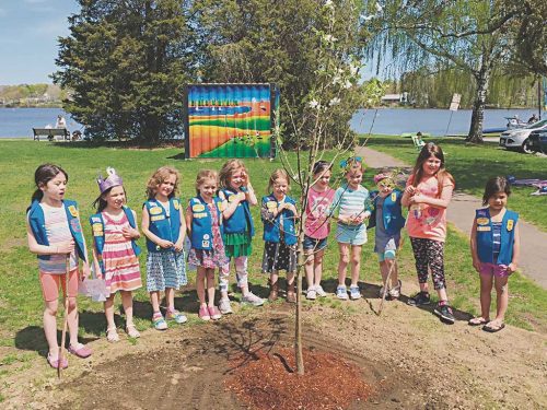 GIRL SCOUT 82220 recently helped the Wakefield Department of Public Works (DPW) plant a flowering crab tree in Hall Park to commemorate Arbor Day and Earth Day. The new tree replaces one that was lost in an early Spring storm, according to Dennis Fazio, DPW Cemetery, Forestry and Parks Department Supervisor. The local scouts approached the DPW with a plan to replace the tree as they worked to complete their Take Action Badge. “This was a great way for the girl scouts to earn their badge while giving back to the community,” Fazio said. “The DPW was glad for their help and for the opportunity to plant a tree in honor of Arbor Day.” (Courtesy Photo)