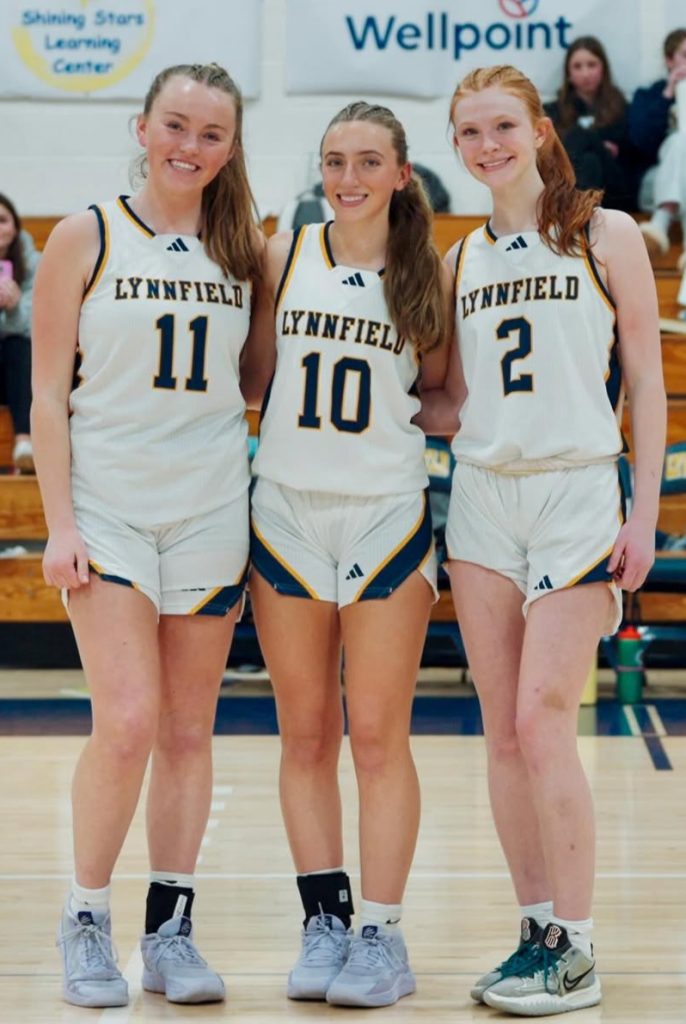 THE THREE LHS girls’ basketball senior captains were honored before Lynnfield’s victory over Triton on Feb. 12. Pictured from left to right is Taylor Valiton, Emma Rose and Erika Pasquale. (Courtesy Photo)