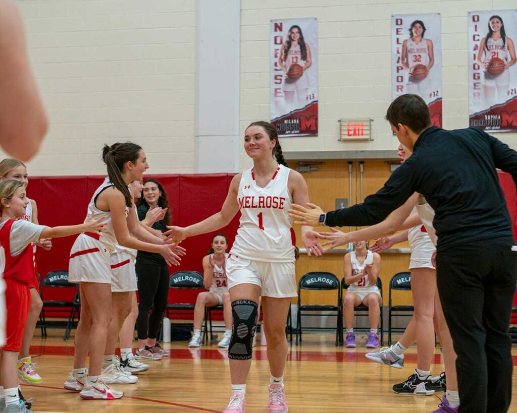 “Winchester played a great game and shot extremely well in the 4th quarter. We were able to fend them off with solid defense and great foul shooting in over time (7-10) to pull out the win,” said Melrose head coach Andrea Razi-Thomas. “I was particularly proud of Scarlett [D’Addio] for leading us to that victory. She really took the game in her own hands in the 4th quarter when they made a run. She refused to lose, drawing fouls, getting to the line and producing points by knocking down her free throws.”