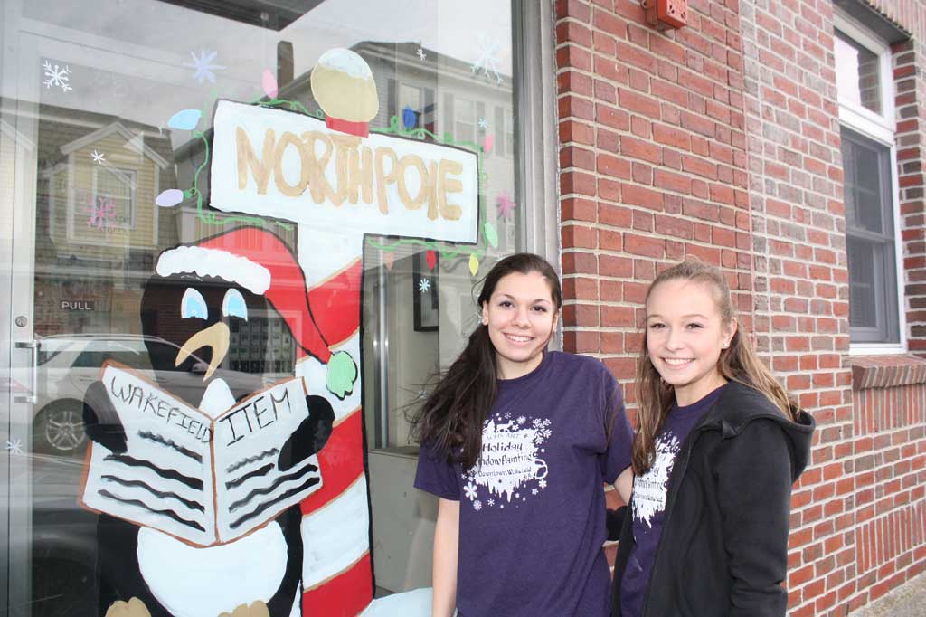 A FESTIVE penguin visiting the North Pole catches up on the latest news back home about the Holiday Stroll in the Wakefield Daily Item. The scene was created from the imaginations of WMHS art students Amber Drinkwater (left), Brianna Racamato and (missing from photo) Helen Salvatore. Dozens of WMHS art students helped transform downtown Wakefield storefronts into a colorful winter wonderland to celebrate the holidays in conjunction with the Holiday Stroll events. (Maureen Doherty Photo)