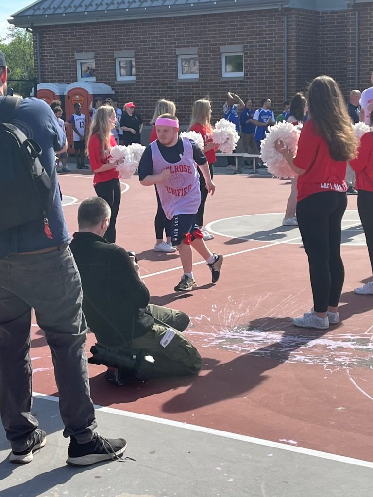 Melrose High senior Unified players particularly relished the opportunity to battle the best in the Middlesex League. They included Kevin Burke, Nick Cram, Claire Morse, Ben Donovan and Harry Jaggers. Another, James “The President” Kavanaugh, had some serious pre-game plans. “We’re ready to play, it’s going to be awesome,” he said. “It’s a beautiful day.” When asked how many points he predicted he’d make he noted, “I’m going to go for three’s. We’re going to play as a team to beat everyone.” He also had someone close in his mind. “This game goes out to my friend Grace Zinck.” Zinck, a former Unified player for Melrose High, passed away at the early age of 17 in 2021.