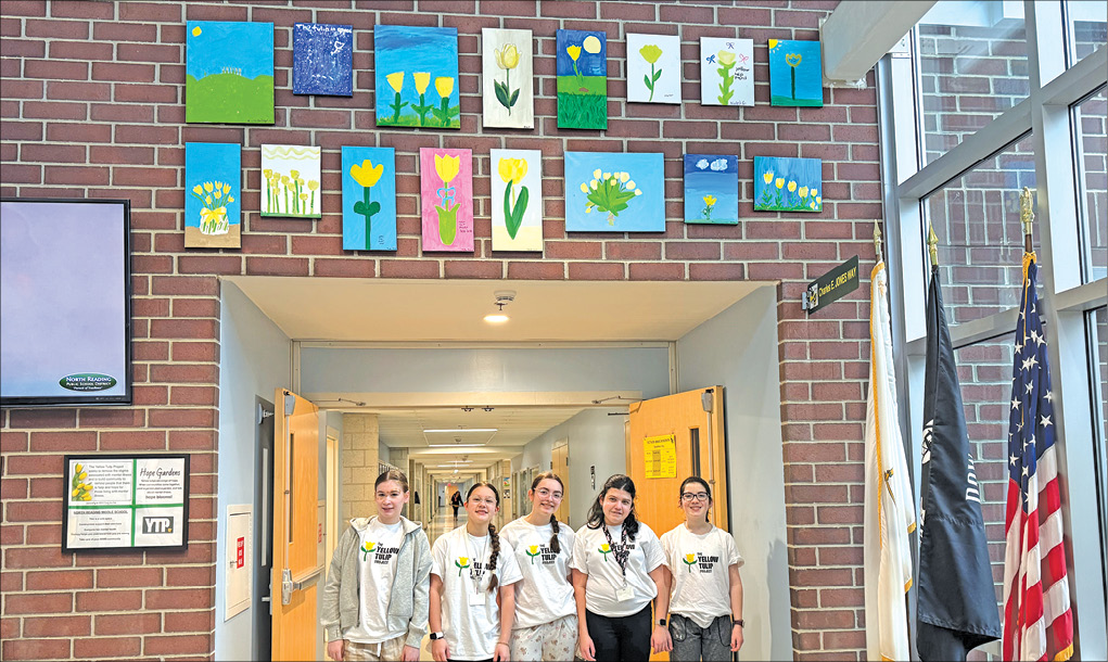 STUDENT ART depicting yellow tulips, a symbol of hope, were displayed in the foyer of NRMS last spring on “Wear Yellow or PJs Day,” which raised the funds used to purchase yellow tulip bulbs planted by Early Act Club members this fall in the school’s garden. (Courtesy Photo)